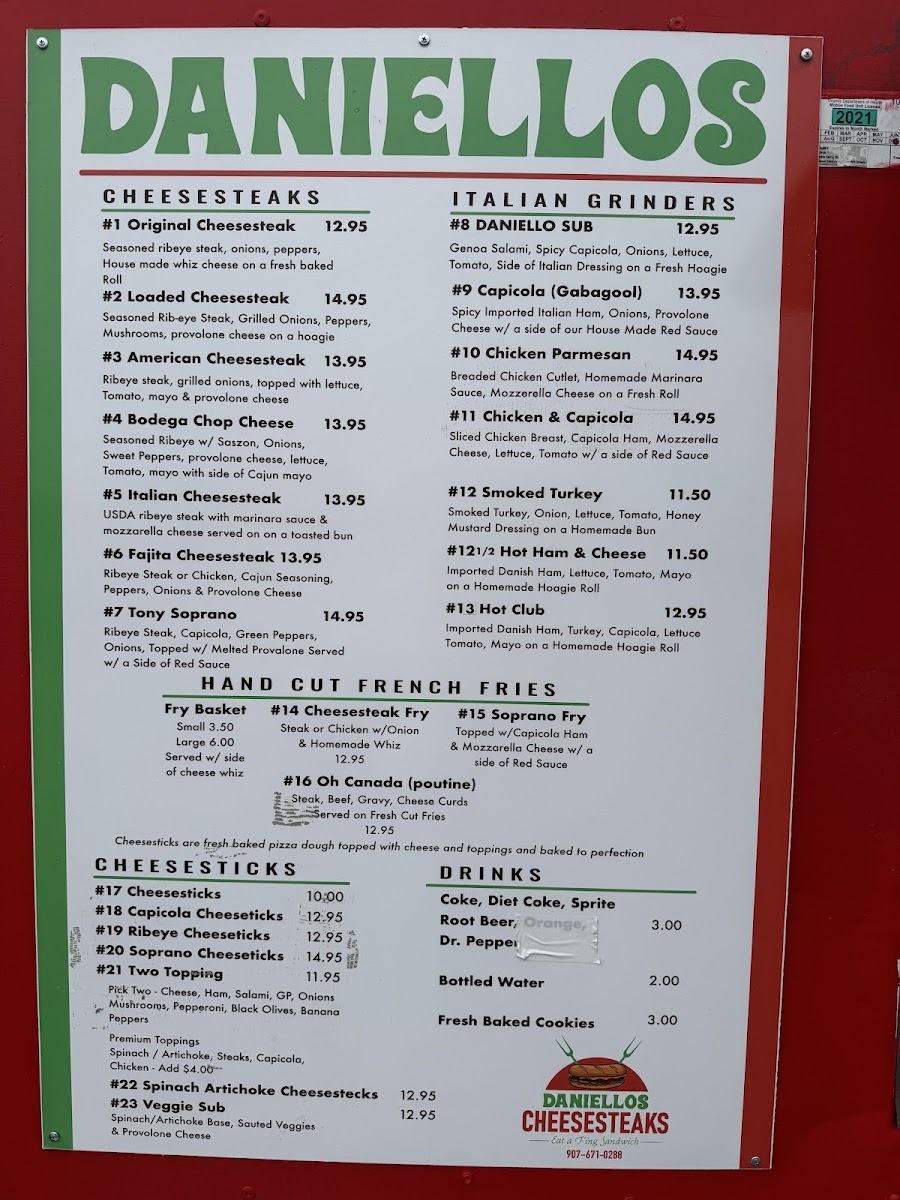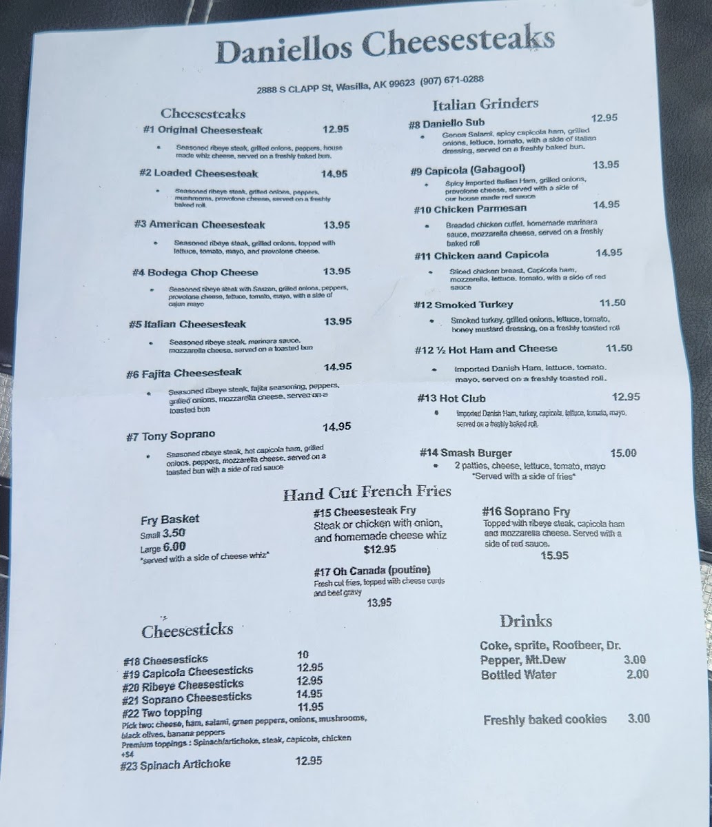 Welcome to Daniellos Cheesesteaks, where authentic Italian flavors meet the heart of Wasilla, AK. This charming eatery specializes in mouthwatering cheesesteaks that have quickly become local favorites. Each option showcases seasoned ribeye steak, with the Original Cheesesteak featuring grilled onions and house-made whiz cheese for just $13.95. For those wanting a bit more, the Loaded Cheesesteak adds peppers and mushrooms for a delicious and hearty experience.